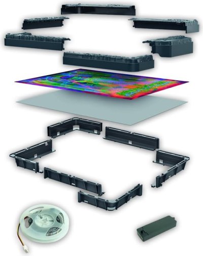 Balenie obsahuje: puzzle, tvrdý kartón, lepidlo, montážny plastový rám, elektronický modul, RGB LED pásik, referenčný plagát a návod na použitie. Pri rozsvietenom svetle sa zobrazí obrázok ako prekrytie troch farebných úrovní. Keď svetlo zhasnete a zapnete LED, uvidíte obraz zodpovedajúci farbe LED.
