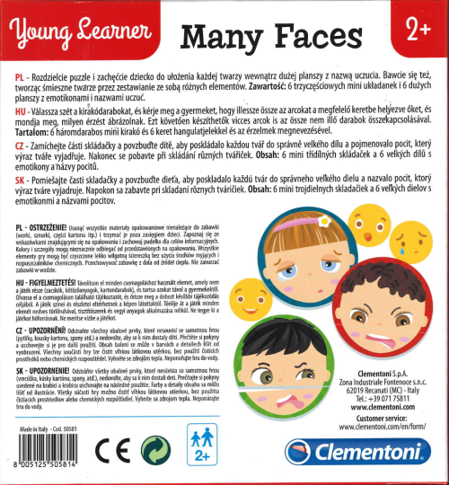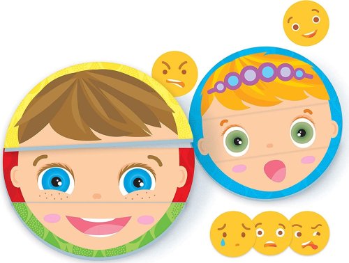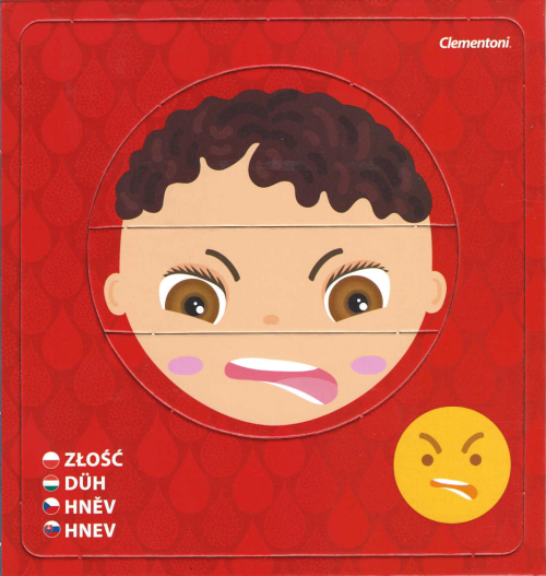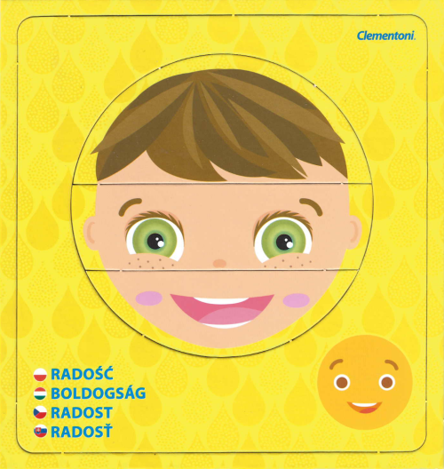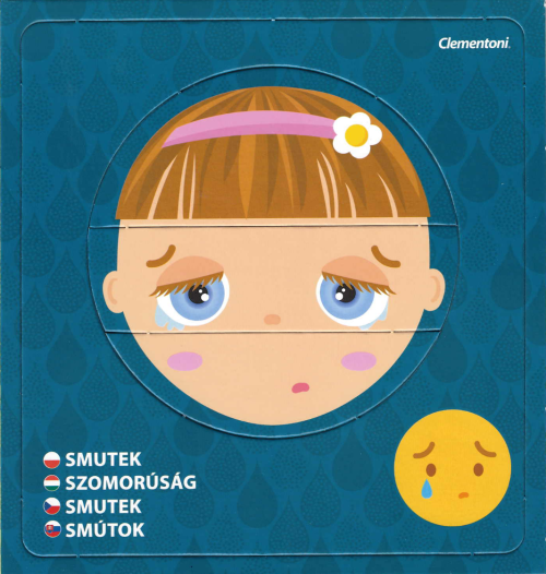 Balenie puzzle obsahuje 6 puzzle obrázkov po 3 dielikoch. Na každom obrázku je znázornená tvár vyjadrujúca náladu. Deti môžu skladať jednotlivé tváre samostatne alebo ich poskladať do zodpovedajúceho rámčeka, na ktorom je názov pocitu a zodpovedajúci emotikon-smajlík.