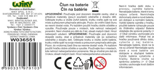 Čln. Rozmery 22,5x6,5x7 cm. Pohon na batérie. 2xAA batérie nie sú súčasťou. 2 farebné varianty: modrá, biela.