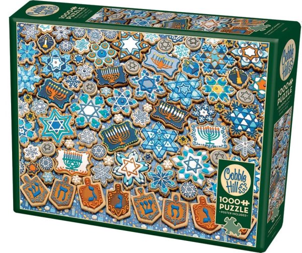 Chanuka je Sviatok svetiel, ktorý sa oslavuje na pamäť zázraku, ktorý sa stal, keď Židia po príchode do Chrámu, znesväteného vojskami, našli iba jednu nádobu s čistým olejom pre chrámovú menoru-svietnik. Olej by stačil snáď na jeden deň, avšak horel celých osem dní, kým bol vylisovaný a pripravený olej nový. Na sušienkach sú znázornené chanukové svietniky, dreidely aj Dávidove hviezdy. Raznica puzzle COBBLE HILL nekopíruje štandardnú mriežku, rohy a hrany dielikov nie sú vždy v jednej osi a dieliky majú neobvyklý tvar. Obtiažnosť puzzle je tak vyššia ako pri klasickej mriežkovej raznici, ktorú používajú poprední výrobcovia v Európe. V balení je predloha o veľkosti 31,6 x 22,9 cm. Rozmer zloženého puzzle cca 67,6 x 48,9 cm