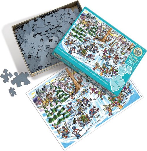 Skladá celá rodina! Jedinečnosť rodinného puzzle od výrobcu Cobble Hill spočíva v tom, že balenie obsahuje dieliky v troch odlišných veľkostiach. Dieliky majú malú, strednú a veľkú veľkosť a skladanie je tak pohodlné pre deti, rodičov i starých rodičov. V jednej časti obrázku sú veľké dieliky, ktoré sú vďaka svojim rozmerom vhodné pre menšie deti. Na druhej strane skladaného motívu sú malé dieliky, vhodné pre dospelých a väčšie deti, ktoré sú už zvyknuté skladať puzzle. Prostredná časť puzzle obsahuje dieliky strednej veľkosti, na týchto dielikoch ide zreteľne vidieť skladaný motív a zostavovanie obrázku je tak vhodné pre staršie deti, babičku aj deduška. Veľkosti dielikov: veľké cca 6 cm stredné cca 3,5 cm malé cca 2 cm Raznica puzzle COBBLE HILL nekopíruje štandardnú mriežku, rohy a hrany dielikov nie sú vždy v jednej osi a dieliky majú neobvyklý tvar. Obtiažnosť puzzle je tak vyššia ako pri klasickej mriežkovej raznici, ktorú používajú poprední výrobcovia v Európe. Rozmer zloženého puzzle cca 67,6 x 48,9 cm