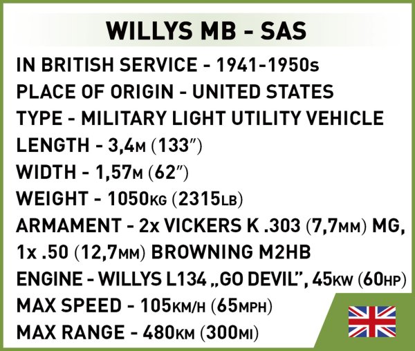 Postavte si model Willys. Licencovaný Willys Jeep bol vydaný vo farbách britských jednotiek SAS. Svetovo najobľúbenejšie terénne vozidlo z druhej svetovej vojny.Prezentovan ý model sa výrazne líši od tých vo výzbroji americkej armády. Čo naozaj upúta, je veľmi charakteristická vykrojená mriežka vozidla s kondenzátorom vedľa. Táto úprava továrenského vozidla umožňuje prevádzku v ťažkých púštnych podmienkach, kde sa veľmi ľahko prehreje! Balenie obsahuje 180 kociek a 3 figúrky.