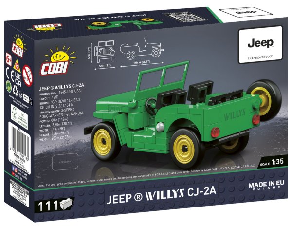 Postavte si model JEEP WILLYS CJ-2A, vyvinutý v mierke 1:35, obsahuje špeciálne navrhnuté prvky s charakteristickou mriežkou Willys a okenným rámom. Potom, čo firma Willys-Overland v roku 1944 vyrobila pre armádu malé terénne vozidlo, bol v nasledujúcom roku uvedený na trh produkčný variant pre súkromných zákazníkov, označený továrenským kódom CJ-2A. Prvá generácia Willys CJ predstavila v masovom meradle proporcie karosérie charakteristické pre neskoršie modely Jeep, vrátane jasne vyznačených blatníkov, vypuklé kapoty, okrúhlych, úzko rozmiestnených svetlometov a zvislých líšt masky chladiča. Balenie obsahuje 111 kociek.