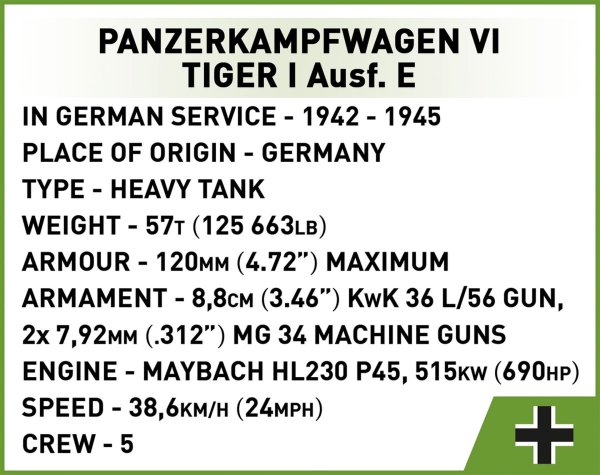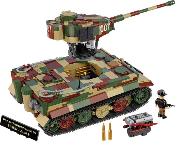 Postavte si model Panzerkampfwagen VI alebo Tiger nemecký ťažký tank z druhej svetovej vojny. Jeho charakteristický tvar je dodnes rozpoznateľný po celom svete. Samotné vozidlo sa stalo legendou a je stále prítomné nielen v historických materiáloch, ale aj v popkultúre. Prvé jednotky Tiger boli dodané na front v blízkosti Leningradu a Tuniska v auguste/septembri 1942. Tank navrhnutý a vyrobený firmou Henschel bol veľmi moderný a účinný. Bohužiaľ jeho výroba spotrebovala obrovské zdroje cenných surovín a času. Tiger I a niekoľko tankov Tiger II mali významný vplyv na priebeh nepriateľských akcií. Neslávne známe a desivé tigre zničili vyše 10 300 spojeneckých tankov a 11 380 diel s vlastnými stratami 1 725. Balenie obsahuje 1207 kociek a 1 figúrku.