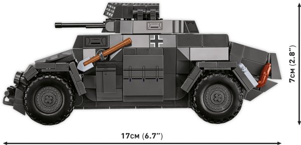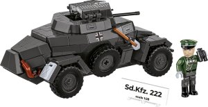 Postavte si model Sd.Kfz 222 jeden z najznámejších nemeckých vozidiel z druhej svetovej vojny, čo je dôležitým prvkom prieskumných síl Wehrmacht. Vďaka svojmu ľahkému pancierovaniu a vysokej mobilite bol Sd.Kfz . 222 používaný predovšetkým na identifikáciu, stráženie a podporu pechoty na rôznych vojnových frontoch. Predné strany vozidiel boli chránené s hmotnosťou 8 mm hrubým oceľovým plechom, tenším, 5 mm plechu, chráneným vrchným, zadným a podvozkom. Vojnová nebola obrnená zhora, z tejto strany bola posádka chránená iba sieťkou chrániacou pred granátmi a ľahkými šrapnelmi. Balenie obsahuje 502 kociek a 1 figúrku.