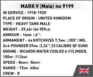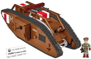 Postavte si model Mark V (mužská verzia) britský tank bol vyrobený v roku 1918 na konci prvej svetovej vojny. Nádrž bol vybavený dvoma delami o dĺžke 57 mm a piatimi guľometmi prevádzkovanými osemčlennou posádkou. Mark V sa pohyboval rýchlosťou rozchodu 7,4 km/ha mohol pokryť 65 km! Takéto tanky sa zúčastnili stretov v Homele, Amiens a Hindenburg linke na západnom fronte. Balenie obsahuje 844 kociek a 1 figúrku.