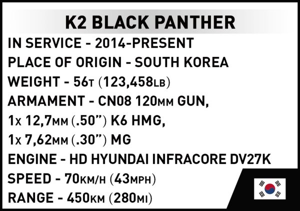 Postavte si model K2 Black Panther je hlavný bojový tank tretej generácie vyvinutý v Južnej Kórei v 21. storočí. Ako nástupca tanku K1 je to rozhodne jeden z najmodernejších tankov na svete. Kombinuje palebnú silu, mobilitu a pokročilé technológie. V poslednej dobe sa tanky tohto typu stali súčasťou výzbroje poľskej armády. Balenie obsahuje 160 kociek.