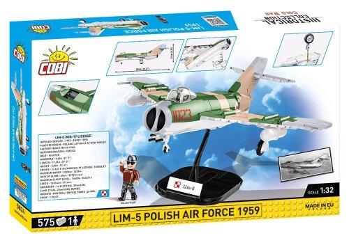 Postavte si model stíhacieho lietadla Lim-5 je sovietsky licenčný Mikoyan MiG-17F vyrábaný poľským leteckým priemyslom v Mielci, kde vyrábame naše stavebnice. Prvé lietadlo Lim-5 vstúpilo do služby v roku 1957 a celkom bolo postavených 477 lietadiel. Náš model má kamufláž a značenie podľa historického lietadla, ktoré je dnes technickou pamiatkou. Balenie obsahuje 575 kociek stavebnice a figúrku pilota.