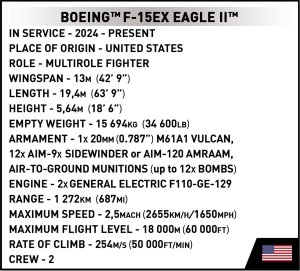 Postavte si model Boeing F-15EX Eagle II je nielen modernou verziou legendárneho F-15, predstavenou Boeingom v reakcii na rastúce potreby amerického letectva, ale skutočnou poctou F-15, poctu, ktorá ide ďaleko do budúcnosti leteckých technológií. Prvé F-15EX boli objednané v roku 2020 a dnes je to jeden z najmodernejších stíhačiek na svete, vybavených pokročilými avionickými systémami, vrátane radaru AESA APG-82, ktorý poskytuje bezkonkurenčnú detekciu a sledovanie cieľov. Zvýšená noha zbraní (až 22 rakiet) a moderných systémov riadenia letu ju robí schopnou splniť najnáročnejšie bojové misie. Balenie obsahuje 739 kociek a 2 figúrky.