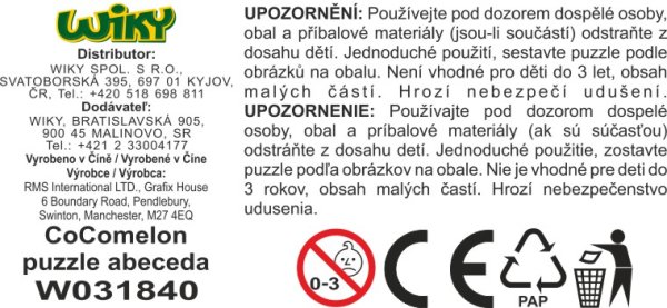 Je to zábavný spôsob, ako deťom predstaviť abecedu Veľké dieliky puzzle sú pre malé ručičky ľahko uchopiteľné a poskladané Cocomelon Puzzle abeceda 88x53cm 30 pestrofarebných dielikov puzzle obsahuje postavy z populárnej televíznej show Cocomelon Rozmery balenia sú šírka 23,4 cm, výška hĺbka 9 cm
