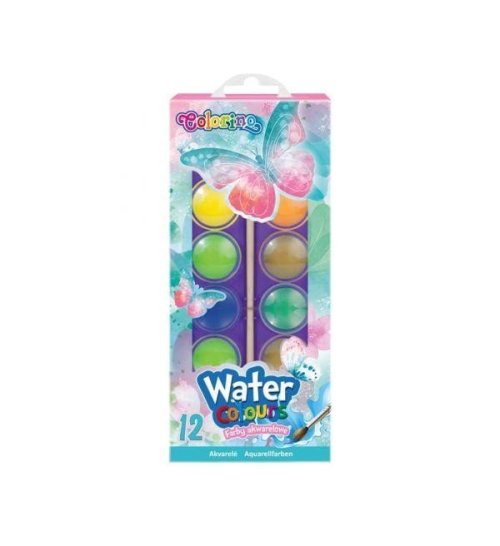 Kvalitné vodové farby s vysokým podielom pigmentu. Pri opakovanom používaní nepopraskajú. Praktické plastové puzdro s okrúhlym štetcom s drevenou násadkou.