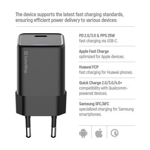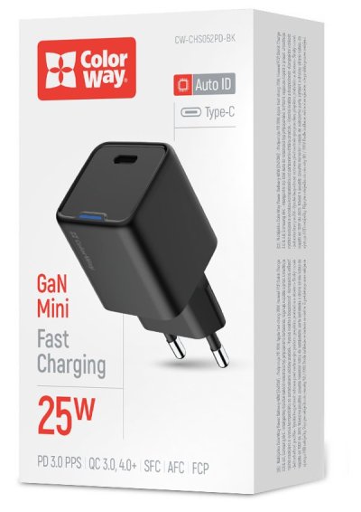 ColorWay GaN Mini predstavuje modernú kompaktnú nabíjačku využívajúcu pokročilú GaN (Gallium Nitride) technológiu , ktorá zaisťuje menšie rozmery, nižšiu hmotnosť a vyššiu účinnosť oproti tradičným adaptérom. S maximálnym výkonom 25 W a podporou najnovších rýchlonabíjacích protokolov vrátane PD 3.0 PPS, Apple Fast Charge a Quick Charge 4.0+ ponúkajú optimálne riešenie pre každodenné nabíjanie aj cestovanie.
