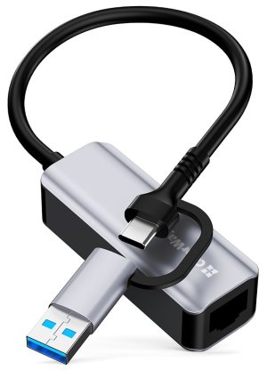 Univerzálny sieťový adaptér pre rýchle pripojenie k drôtovej sieti cez USB alebo USB-C port.