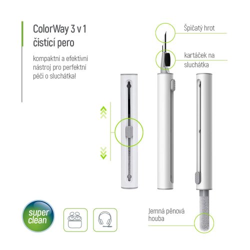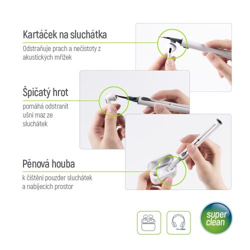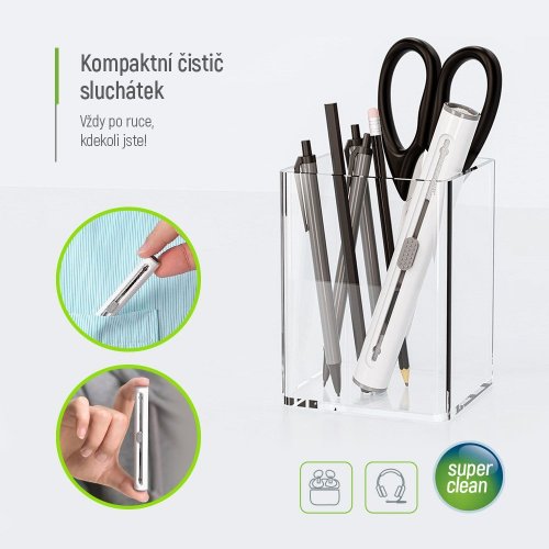 Univerzálny čistiaci nástroj navrhnutý pre dôkladnú údržbu slúchadiel . Vďaka trom rôznym nástavcom efektívne odstraňuje nečistoty, prach a ušný maz z ťažko prístupných miest bez toho, aby poškodil povrch či jemné komponenty. Kompaktný a ľahký dizajn umožňuje ľahké prenášanie a použitie kdekoľvek – doma, v kancelárii alebo na cestách. Každá časť čistiaceho pera má svoju špecifickú funkciu. Penová huba sa dostane do hlbších častí puzdra slúchadiel a odstráni usadený prach. Jemná kefka efektívne vyčistí mriežky reproduktorov a ďalšie citlivé časti, zatiaľ čo špicatý hrot pomôže odstrániť ušný maz. Vďaka intuitívnemu posuvnému mechanizmu je možné ľahko prepínať medzi jednotlivými nástavcami podľa aktuálnej potreby.