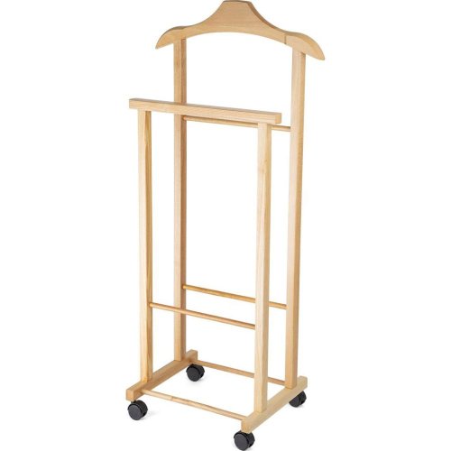 Dvojitý závesný priestor Rôzna výška závesného ramienka a tyče Kolieska Rozmery: 97 x 33 x 29 cm Materiál: drevo Farba: svetlé drevo