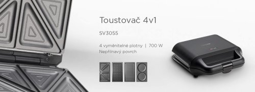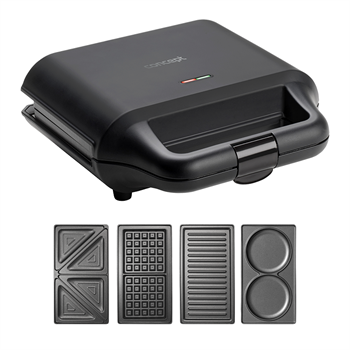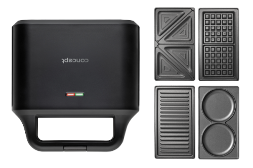 Hriankovač 4v1 Concept SV3055 v elegantnom čiernom dizajne vám pomôže s rýchlou prípravou raňajok, obed, desiaty aj večere. Vďaka štyrom vymeniteľným doskám ponúka široké využitie. Stačí si len vybrať, na čo máte práve chuť. V jednom tele získate hneď štyroch praktických pomocníkov, ktorí vám v kuchyni zaberú minimum miesta.