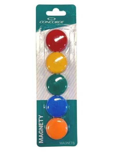Farebné okrúhle magnety s priemerom koláča 35mm. Priemer vnútorného magnetu 1,6mm. Magnety sú vhodné kdekoľvek Vás napadne, napríklad na nástenky, flipcharty, tabule alebo aj chladničky. Balenie obsahuje 5 kusov na blistri.