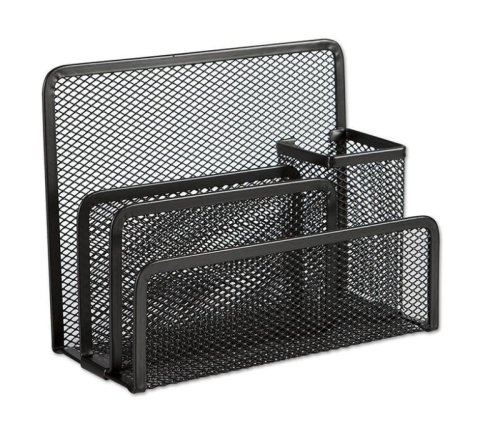 Kovový organizér na listy a písacie potreby v čiernej farbe. Rozmery: šírka 17cm, výška 13,5 cm, hĺbka 8,3 cm.