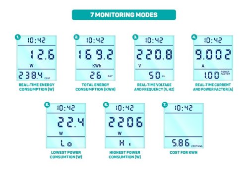 Merač spotreby elektrickej energie dokáže vypočítať zodpovedajúce finančné náklady a odhaliť, ktorý spotrebič odoberá najviac elektrickej energie a jeho prevádzka je teda najnákladnejšia. Medzi ďalšie funkcie merača patrí meranie elektrických veličín - napätie, okamžitý odoberaný výkon, prúd, frekvencia, najvyššia a najnižšia spotreba. Tieto informácie Vám môžu prispieť k zníženiu nákladov za elektrickú energiu.
