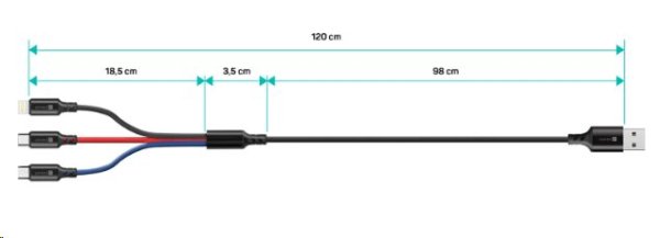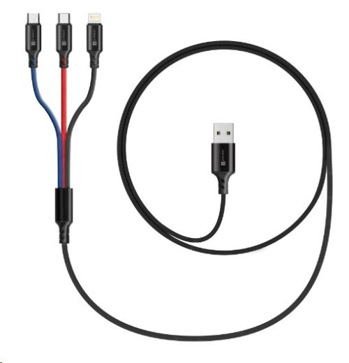 Univerzálny nabíjací kábel 3v1 na nabíjanie zariadení s konektormi Micro USB, Lightning a USB-C (Type C) umožňuje nabíjanie až troch zariadení súčasne s podporou rýchleho nabíjania pomocou max. prúdového toku 2 A. Špeciálna manžetová nadstavba konektorov Micro USB, Lightning aj USB-C (Type C) zaručuje lepší prístupnosť.