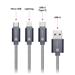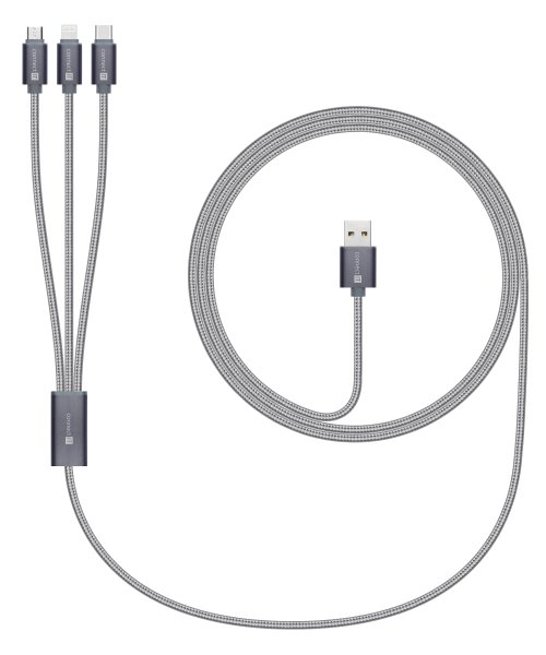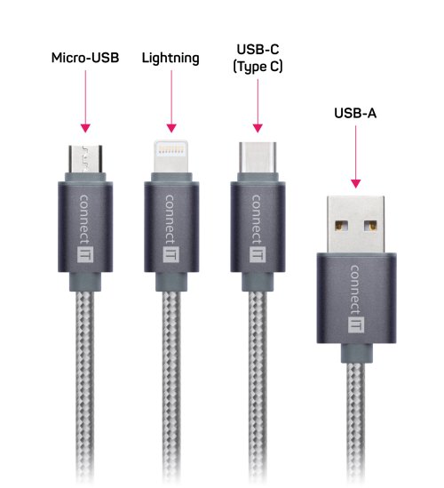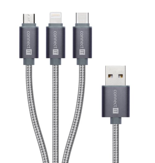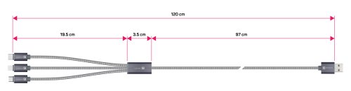Univerzálny nabíjací kábel 3v1 na nabíjanie zariadení s konektormi Micro USB, Lightning a USB-C (Type C) umožňuje nabíjanie až troch zariadení súčasne s podporou rýchleho nabíjania pomocou max. prúdového toku 2 A. Špeciálna manžetová nadstavba konektorov Micro USB, Lightning aj USB- C (Type C) zaručuje lepšiu prístupnosť k nabíjacím zdierkam mobilných telefónov v puzdrách.