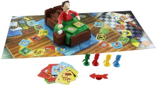 Poznáte to! Prevaľujete sa v posteli, nemôžete zaspať a tú vás začne naháňať na sladké. A v chladničke si hovie úžasný čokoládovú tortu. Má to ale háčik. Musíte prejsť celým bytom, kde na vás číha veľa nástrah v podobe špendlíkov, domáceho zvieratstva, ovládačov a hračiek. A ešte sa musíte preplížiť okolo spiaceho otca tak opartně, aby ste ho nevzbudili! Uložte otca do postele. Okamžite zaspí a začne hlasno chrápať. Potom roztočte ruletu a postúpte na políčko rovnakej farby. Ak je na ňom napísané číslo, stlačte toľkokrát budík na nočnom stolíku vedľa otcove postele. Ak sa otec prebudí, musíte sa vrátiť späť na štart a môžete si vziať od jedného zo svojich spoluhráčov kartu. Pokiaľ však stojíte na políčku s číslicou, ale vlastníte kartu s rovnakým obrázkom, ako je na políčku, nemusíte stláčať budík. Vyhráva hráč, ktorý ako prvý šlohne tortu z chladničky. Hra vyžaduje 2 x AA batérie (nie sú súčasťou balenia). Obsahuje: Otca v posteli, hraciu plochu s ruletou a 16 kartičiek s obrázkami.
