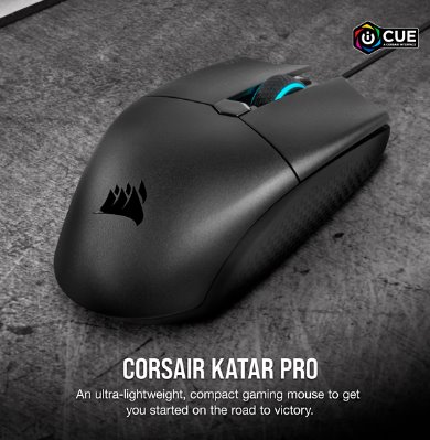 Technické parametre *Pripojenie: Káblové USB *Počet tlačidiel: 6 *DPI: 12 400 DPI *Senzor: PAW3327 *Typ senzora: Optický *Podsvietenie myši: 2 Zone RGB *Typ uchopenia: Claw, Fingertip *Hmotnosť: 69 g (bez kábla) *Kábel: 1,8 m gumový bez zamotania *Farba: Čierna *Software CUE: Podporované v iCUE