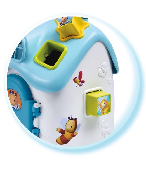 Obľúbený domček - vkladačka vo farebnom prevedení pre chlapčekov. Strecha domčeka so svetelným a zvukovým efektom. Pri vložení správneho tvaru do príslušného otvoru v streche, sa rozsvieti okno a začne hrať hudba alebo sa aktivuje zvuk.Súčasťou domčeka sú 4 farebné kocky. Každá má iný tvar. Pre ľahší prenos má domček na streche madlo.