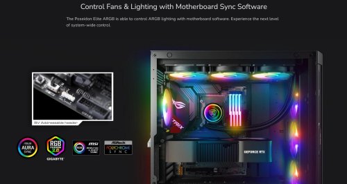 The Poseidon Elite ARGB je ovládateľný pre ARGB blesk s motherboard softvér. Experiencia Next Level of system-wide control.