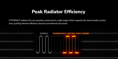 Rebrá radiátora UTTERIGHT sú presne tvarované v pravom uhle, čo zväčšuje plochu na prenos tepla a zvyšuje tepelnú účinnosť nad úroveň konvenčných konštrukcií.