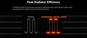 Rebrá radiátora UTTERIGHT sú presne tvarované v pravom uhle, čo zväčšuje plochu na prenos tepla a zvyšuje tepelnú účinnosť nad úroveň konvenčných konštrukcií.