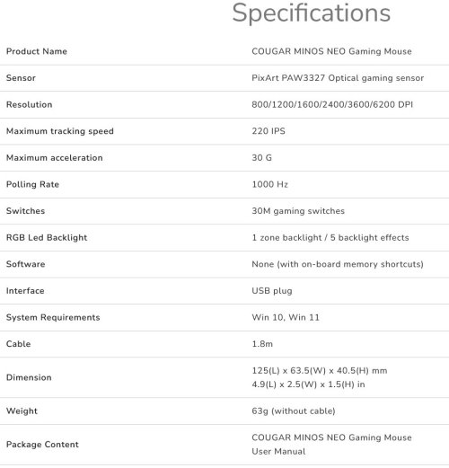 PC myš COUGAR MINOS NEO Black Part Number CGR-WLMB-MINEO