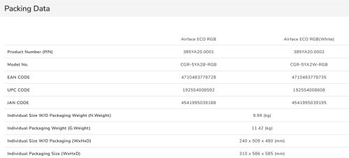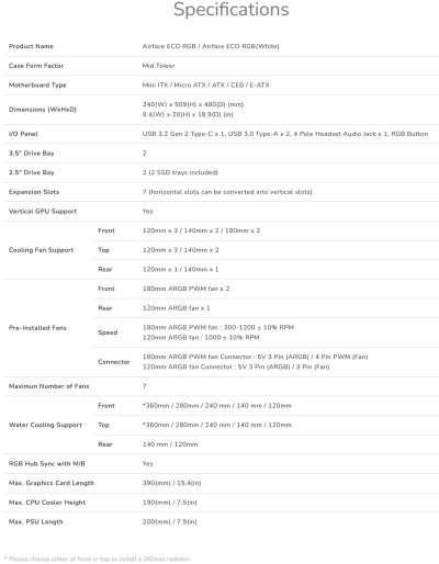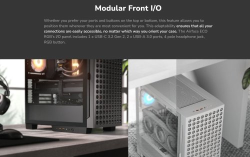 Airface ECO RGB je navrhnutý s dôrazom na ekologickú účinnosť. Kužeľovité vetracie otvory sa zužujú smerom dovnútra od širokého otvoru a využívajú termodynamické princípy k maximálnemu využitiu prúdenia vzduchu prúdiaceho predným panelom. stopu Funkcie, ako je rýchloupínací prachový filter, odnímateľný horný panel a odnímateľný predný držiak, boli do Airface ECO RGB prenesené z modelu Duoface Pro na základe ich osvedčenia. Konštruktívna spätná väzba viedla k vylepšeniam, vrátane rozšíreného vedenia porty a tlačidlá sú ľahko prístupné bez ohľadu na orientáciu skrine. - Kužeľové vetracie otvory využívajú termodynamické princípy na maximalizáciu účinnosti chladenia. predné I/O umožňuje všestranné umiestnenie. - Modernizovaný nový vertikálny priestor pre GPU zlepšuje chladenie. - Rozšírené vedenie káblov.