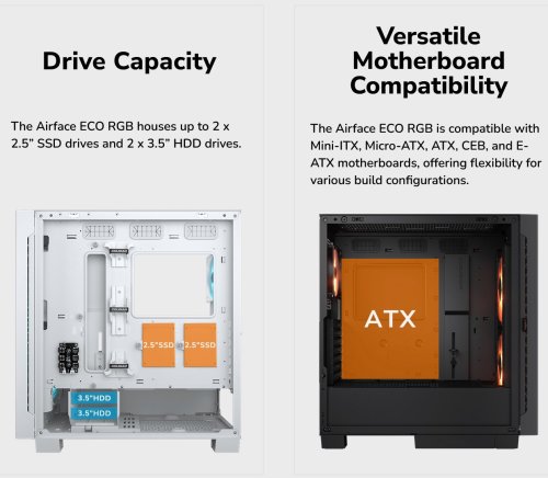 Airface ECO RGB je kompatibilný so základnými doskami Mini-ITX, Micro-ATX, ATX, CEB a E-ATX a ponúka tak flexibilitu pre rôzne konfigurácie zostáv.