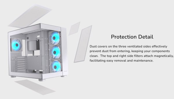 Prachové kryty na troch vetraných stranách účinne zabraňujú vnikaniu prachu a udržujú vaše komponenty čisté. Horný a pravý bočný filter sa pripevňujú magneticky, čo uľahčuje ich vybratie a údržbu.