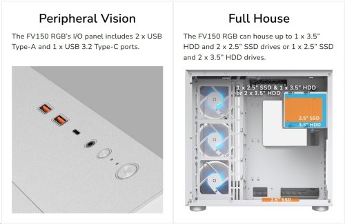 FV150 RGB môže obsahovať až 1 x 3,5" pevný disk a 2 x 2,5" jednotky SSD alebo 1 x 2,5" jednotku SSD a 2 x 3,5" jednotky HDD.