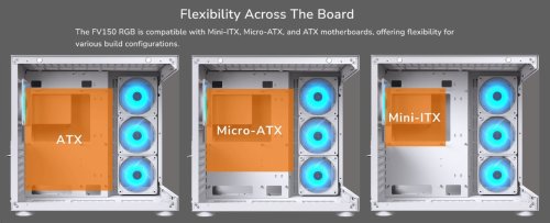 Skriňa FV150 RGB je kompatibilná so základnými doskami Mini-ITX, Micro-ATX a ATX a ponúka tak flexibilitu pre rôzne konfigurácie zostáv.