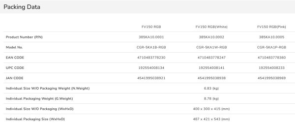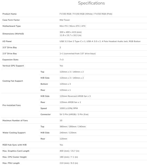 FV150 RGB má kapacitu 3 x 120 mm alebo 2 x 140 mm na hornej a spodnej strane, 3 x 120 mm ventilátorov na bočnej strane a 1 x 120 mm na zadnej strane. (Bočné a zadné ventilátory ARGB sú, okrem rozbočovača ventilátorov, predinštalované.) Podpora vodného chladenia dosahuje maximálne 360 mm na hornej strane a 240 mm na bočnej strane.