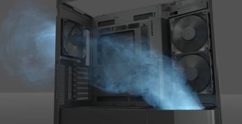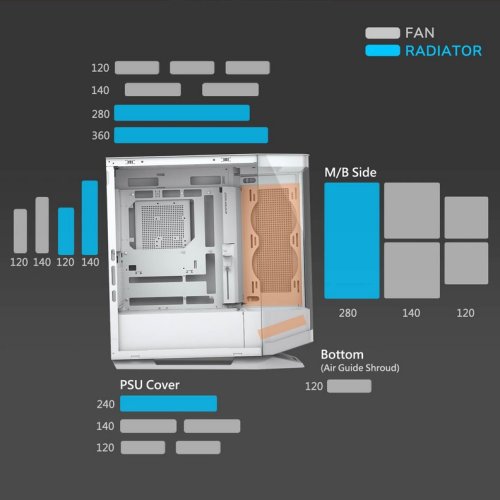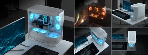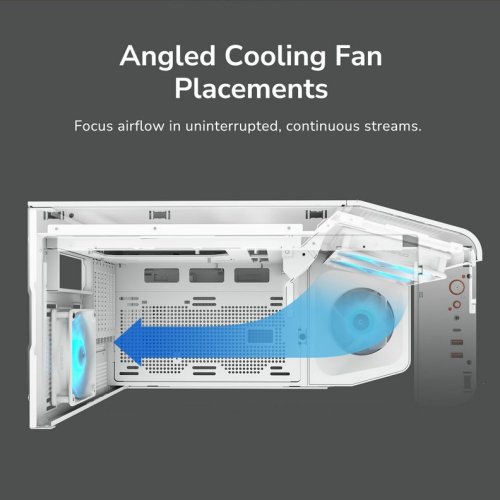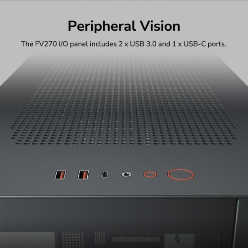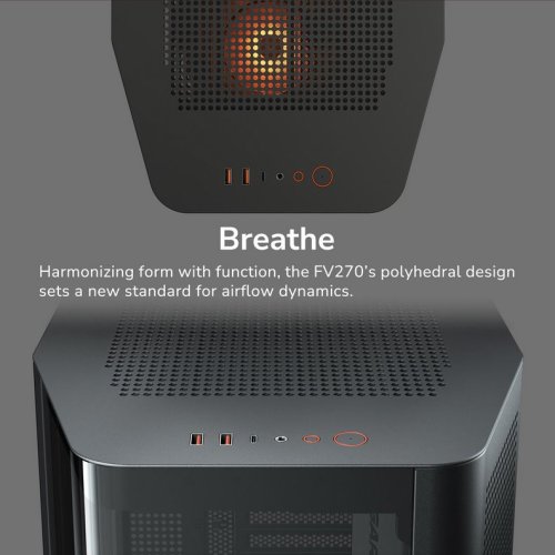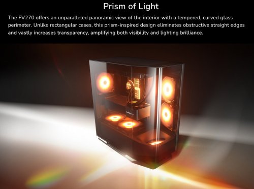 Prizmatický, mnohostenný obvod skrine FV270 RGB vo formáte Midi tower, vytvorený z tvrdeného zakriveného skla, poskytuje bezkonkurenčný panoramatický výhľad na vašu zostavu v celej jej kráse, zatiaľ čo inovatívne umiestnenie uhlových chladiacich ventilátorov revolučným spôsobom mení dynamiku prúdenia vzduchu.