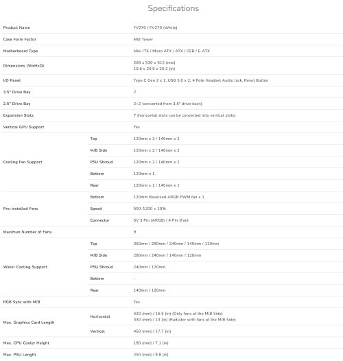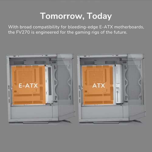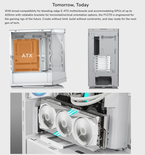 Vďaka širokej kompatibilite s najmodernejšími základnými doskami E-ATX a podpore grafických kariet až do dĺžky 420 mm s otočnými držiakmi pre horizontálnu aj vertikálnu orientáciu je FV270 RGB navrhnutý pre herné zostavy budúcnosti. Tvorte bez obmedzenia, stavajte bez obmedzenia a buďte pripravení na technológiu novej generácie.