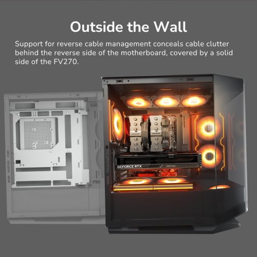 FV270 RGB uľahčuje vedenie káblov dozadu skrine a je pripravený na budúce extrémne zostavy s rezervou pre najmodernejšie základné dosky a grafické karty.