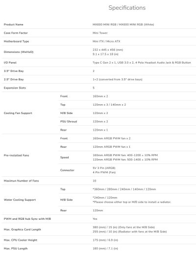 MX600 Mini RGB pioneers integrácie dvojitých 160mm fanúšikov s mini tower, kompacting ich formidable cooling power do malého, space-efficient package. Gaining reverse connector motherboard kompatibility a expanded fanúšik capacity of 10, to tiež inherits full ventilation, strategic filtering, a top 360mm voda chladiaca option of jeho mid-tower predecessor.