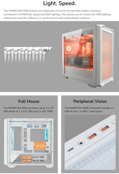 The MX600 Mini RGB features an integrated universal fan húb that enables seamless coordination of PWM fan speed and RGB lighting. Tieto môžu kontrolovať RGB osvetlenie bez potreby pre softvér, alebo synchronizovať to s motherboard softvérom.