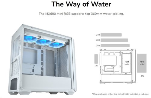 Pohodlná schopnosť 2x 160mm front panel fanúšikov defies the MX600 Mini RGB je deceptively diminutive size. S celkovou úrovňou 10 fanúšikov, even the most performance-intenzívne rig stays cool at peak operation.
