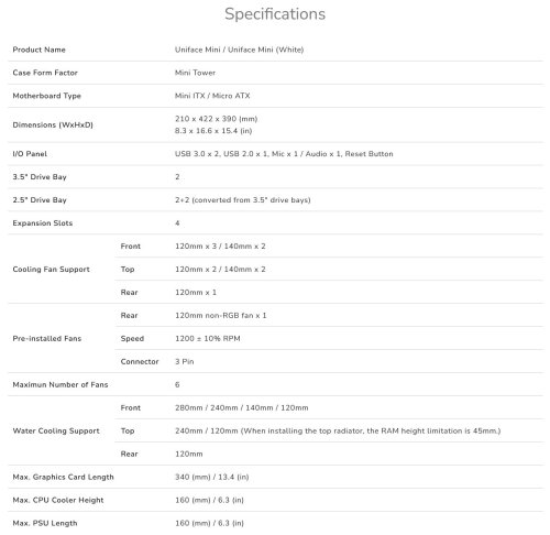 Klamavo kompaktné usporiadanie skrine Uniface Mini umožňuje inštaláciu šiestich ventilátorov a voľbu medzi 280mm chladičom vodného chladenia a 160mm chladičom procesora. Tento obrovský chladiaci potenciál vám umožní postaviť si zostavu snov bez obáv z prehrievania komponentov.