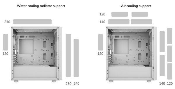 - Podporuje voľbu 280mm (max.) vodného chladenia alebo 160mm (max.) vzduchového chladenia.