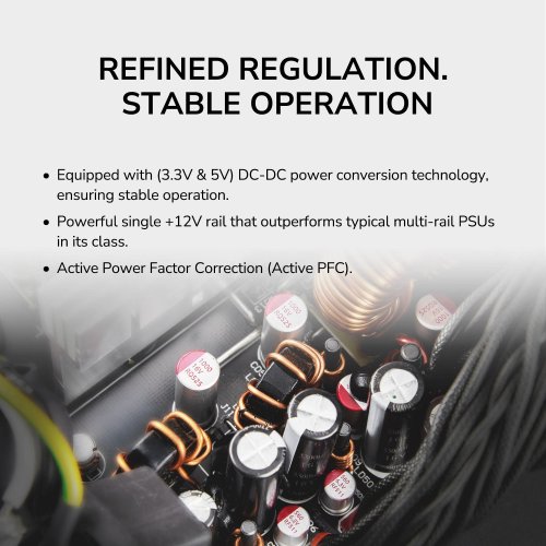 DC-DC technológia poskytuje presnú reguláciu napätia a silná +12V vetva dodáva dostatok výkonu pre náročné komponenty.