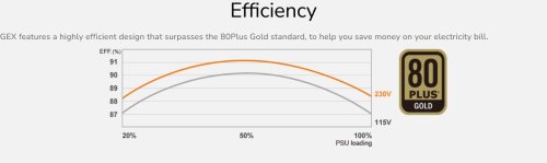 Zdroj GEX sa vyznačuje vysoko účinnou konštrukciou, ktorá prekonáva štandard 80Plus Gold, a pomáha vám tak ušetriť peniaze na účtoch za elektrinu.
