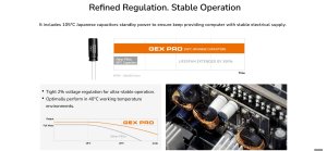Obsahuje 105°C japonské kondenzátory pre pohotovostné napájanie, ktoré zaisťujú, že bude počítaču stále poskytované stabilné elektrické napájanie.