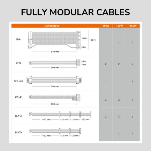 Rad COUGAR GEX PRO podporuje najnovšiu špecifikáciu PCIe 5.1: jej silný a stabilný výkon zodpovedá potrebám grafických procesorov novej generácie a poskytuje dokonalý výkon pre grafické karty novej generácie. Je vybavený modulárnym natívnym konektorom PCIe 12V-2X6 a vďaka dĺžke 650 mm poskytuje dostatočnú vôľu, ktorá znižuje riziko chybného pripojenia pri inštalácii počítača bez toho, aby bolo nutné používať adaptér 6+2 pinov.